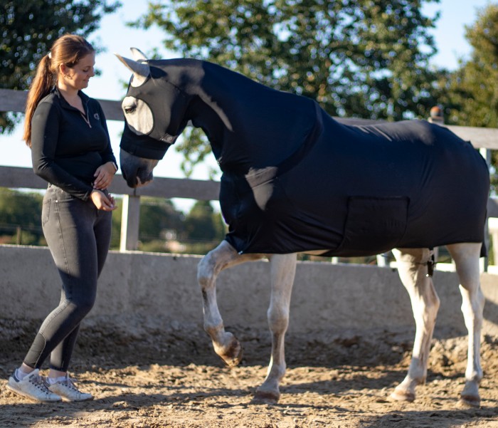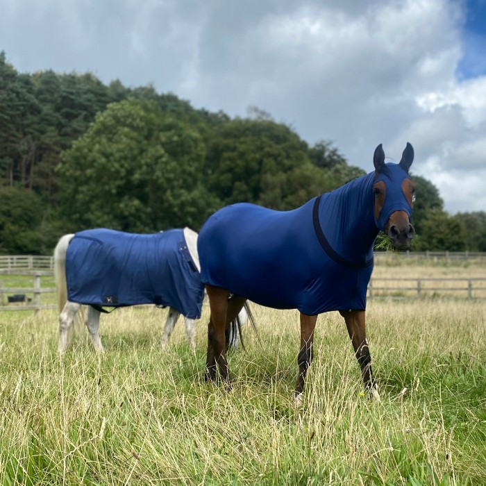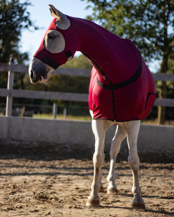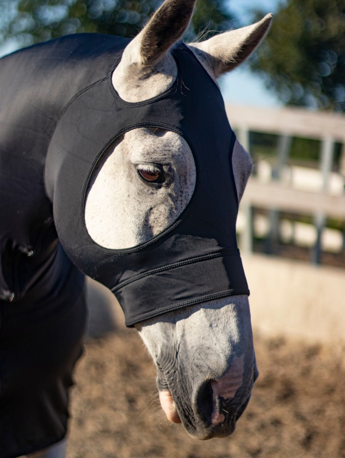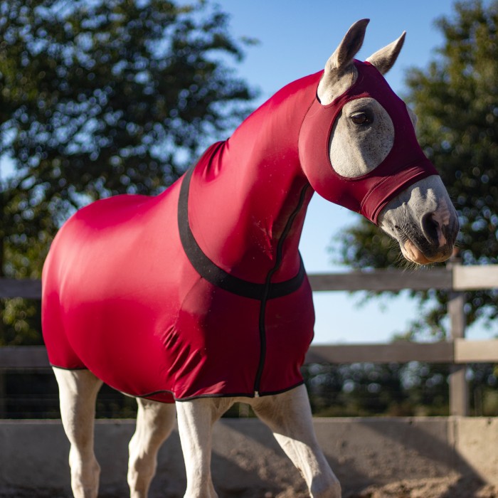 Introducing the All Season Lycra Full Body Slicker with Zipper, a must-have for discerning horse enthusiasts seeking ultimate protection and versatility. This sleek design is made from 220g weight Lycra/Spandex 4-way stretch fabric, providing all-encompassing coverage for face, neck, and body.